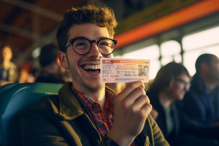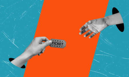 In a bustling environment, two hands are engaged in a transaction, exchanging tickets adorned with barcodes. The scene captures a moment of anticipation and excitement, highlighting the connection between individuals as they prepare for an upcoming event or journey.