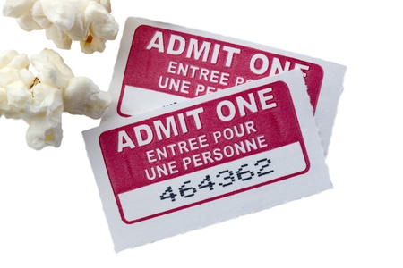 Close up image of pieces of white popcorn and cinema ticket against white background