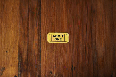 Date night souvenir. a yellow movie ticket isolated on a wooden background.