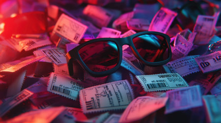 A striking composition features black sunglasses positioned on a colorful pile of movie tickets, creating a lively and upbeat vibe perfect for entertainment enthusiasts.