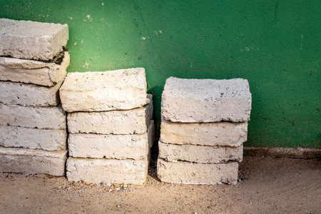 Stacked concrete blocks against green wall in sunlit outdoor scene.