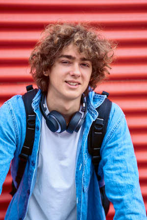 Portrait of a happy smiling teenager with a backpack, a school teenager waiting for a school bus, on his way to school. On the way home from school against the background of the urban landscape