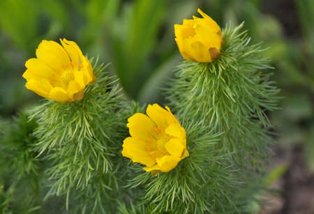 Medicinal herb Adonis vernalis, early spring flowers close up