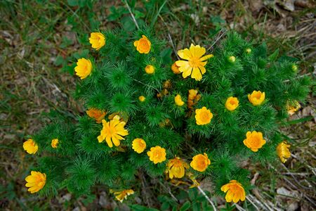 Yellow forest flowers Adonis vernalis, pheasant's eye, spring pheasant's eye, yellow pheasant's eye, false hellebore. The plant is poisonous, containing cardiostimulant compounds.
