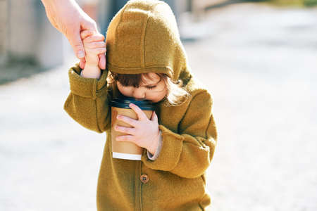 Funny toddler kid walking outside, drinking from take away paper cup, holding mother's hand