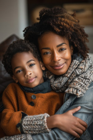 A black mother embracing her charming son in a loving hug on a couch, sharing a tender moment of connection. Motherhood concept