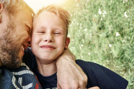 Joyful bearded father hugs handsome smiling blond son spending time in green field with flowers on summer day close view