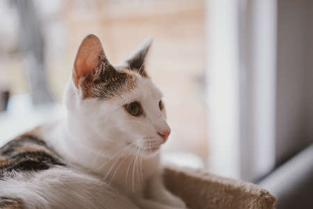 Portrait of a beautiful domestic cat lies in her bed near the window.