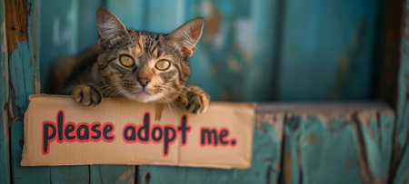 Expressive tabby cat peers over a cardboard sign, seeking a loving home