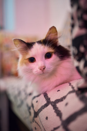Beautiful domestic tricolor cat with green eyes sits on the couch and looks to the side. Close-up, selective focus.