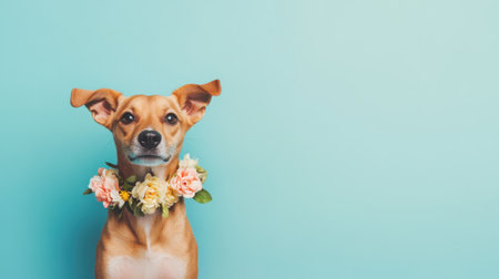 This charming portrait features an adorable dog adorned with a floral crown, set against a soothing turquoise background, capturing the essence of pet personality and joy.