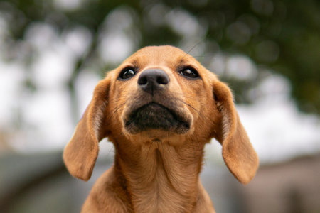 Close-up of brown dog with alert expression, focused gaze, outdoors