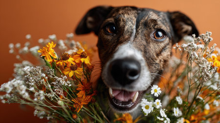 A joyful dog poses among a beautiful arrangement of vibrant flowers, creating a cheerful and lively atmosphere perfect for nature lovers.