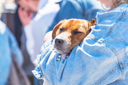 Portrait of a dog in the hands of the owner. Dog sleeping on hands