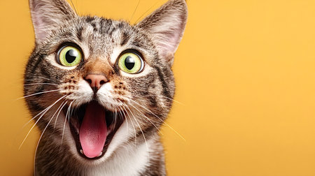 Portrait of a funny tabby cat with wide green eyes and an open mouth, showing shock or amazement while looking directly at the camera on a vibrant yellow background
