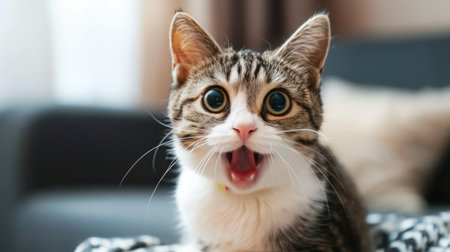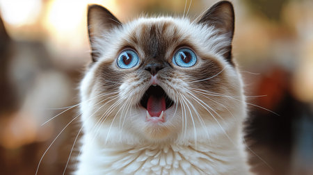 A cat with its mouth open and staring at the camera, AI