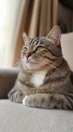 A lovely tabby cat rests on a soft couch, gazing thoughtfully out the window. Sunlight gently illuminates its fur, creating a serene and peaceful atmosphere in the cozy living room.