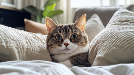 A charming cat nestled among soft pillows, showcasing a peaceful expression in a cozy home environment. Perfect for pet lovers and comfort themes.