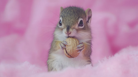 This delightful image features a young squirrel clutching a nut against a soft pink backdrop. The playful expression and fluffy fur capture a tender moment of wildlife delight.