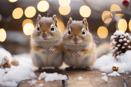 Portrait of an adorable festive Christmas chipmunk wearing a Santa hat in a winter landscape