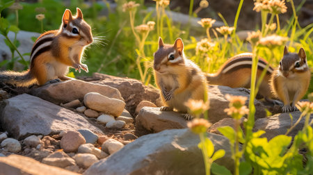 A group of chipmunks standing on a log in the woods. AI generative image.