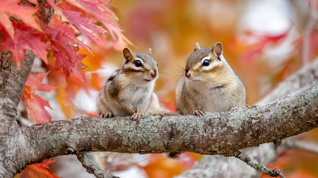 Two chipmunk sitting on a tree branch in the autumn forest