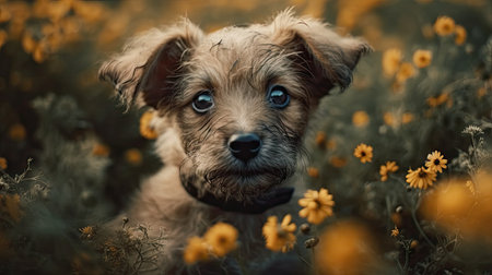 A fluffy puppy with big, soulful eyes playing in a field of flowers, capturing the innocence and joy of youth in the canine world.