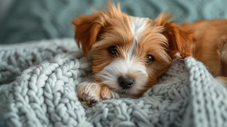 A charming small puppy with fluffy fur and large, expressive eyes rests on a soft blanket, radiating cuteness and warmth in a serene atmosphere.
