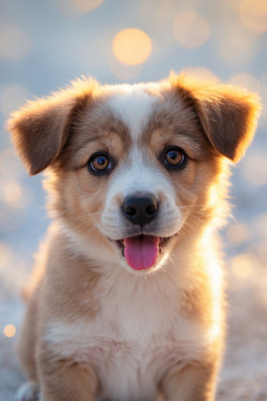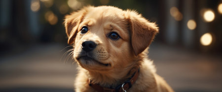 Cute puppy with bright eyes and cheerful expression enjoys a sunny day outdoors in the golden light