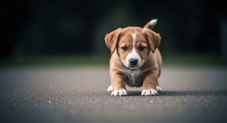 A charming young puppy sits alone on a rainy street, capturing the essence of innocence and playfulness in a quiet urban setting. The wet pavement reflects the surrounding environment, enhancing the mood of solitude and tranquility.