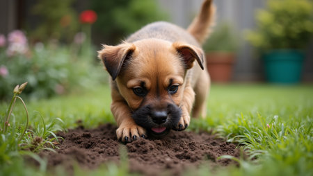 Playful Border Terrier digging in garden fluffy brown fur