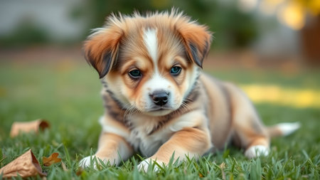 AI Generated. Cute puppy lying on the grass in a natural outdoor setting