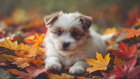 AI Generated. Adorable Puppy Surrounded by Colorful Autumn Leaves in Nature