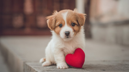 A cute puppy sitting on wooden flooring, holding a red heart-shaped toy. Its innocent expression radiates love and warmth, perfect for pet-themed projects.
