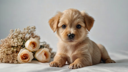 Adorable puppy with watercolor flowers on its head, soft fur and happy expression