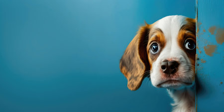 This charming little puppy can't resist its curiosity as it peeks out from around the corner with a pitying look. Its innocent eyes and adorable expression make it impossible not to smile. copyspace. illustration created by Generative AI