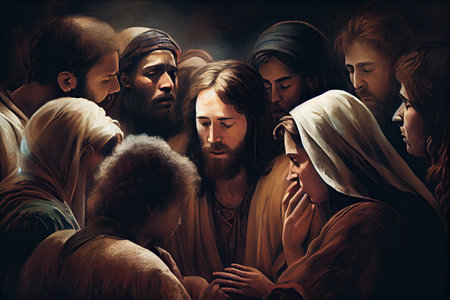 group of people, with jesus christ in the center, sharing their burdens and receiving comfort, created with generative ai