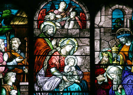 Stained Glass - Nativity Scene - Close-up on a church central window.