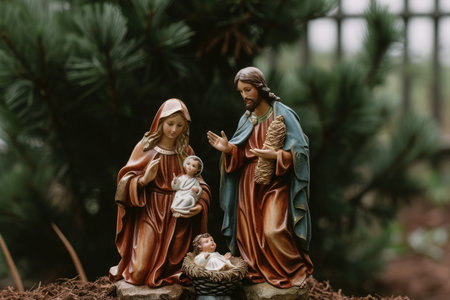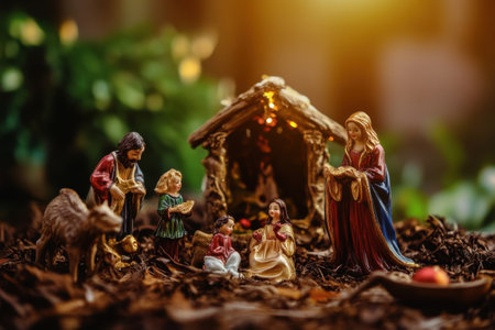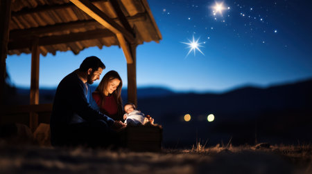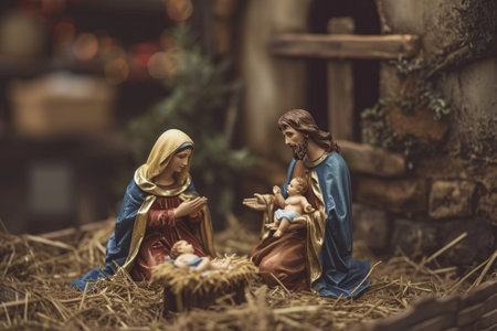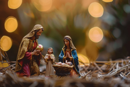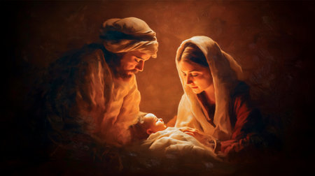 Nativity Scene with Mary, Joseph, and Baby Jesus. Symbolic Christian Christmas with spiritual and festive atmosphere.