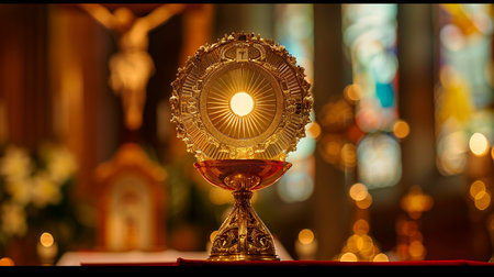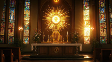 Elegant altar in a church, adorned with a radiant monstrance, candle, and chalice, under soft lighting and stained glass windows