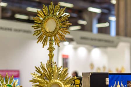 BOLOGNA, ITALY - FEBRUARY 18, 2019: lights are enlightening monstrances at stand of CALANDRINI, in DEVOTIO Religious products and service exhibition