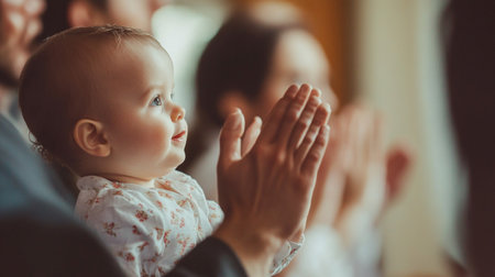 Close-up of hands of priest and little baby praying in church