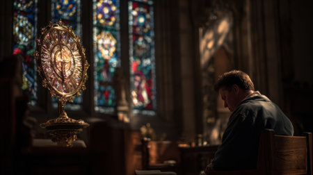 Clergyman prays devoutly in a church, rays of sunlight illuminating him through a colorful stained glass window