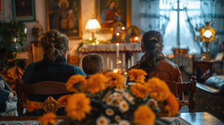 Family gathered in prayer around a Saint Joseph's altar in their home, reflecting a moment of spiritual unity.