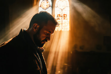Close-up of sorrowful man praying quietly inside a dark church with sunlight shining through, symbolizing faith, grief, and hope.