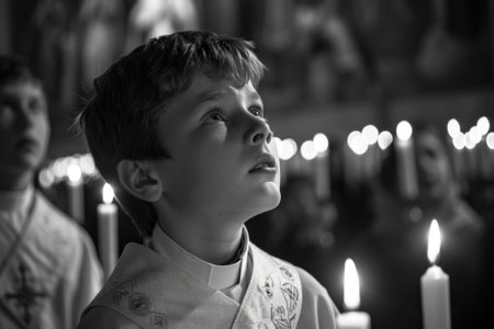Sacred milestone: capturing the essence of first communion in a tender and symbolic portrayal, where young believers embrace the solemnity and spirituality of this significant rite.
