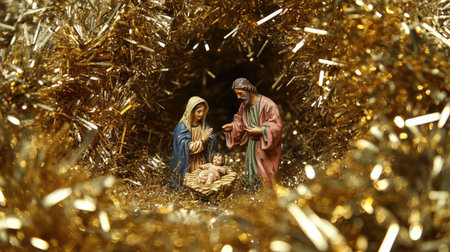 This captivating nativity scene features Mary, Joseph, and baby Jesus, elegantly surrounded by shimmering gold tinsel to enhance the Christmas spirit and festive atmosphere.
