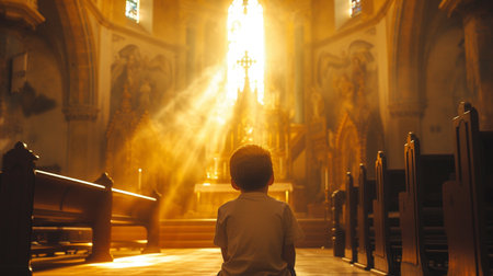 Little boy praying in the church with rays of light in the background