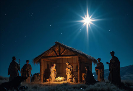 A nativity scene with the star of Bethlehem shining brightly.