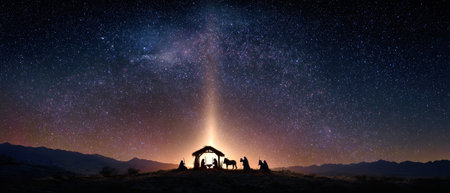 Amidst a colorful sunset, the Nativity scene comes alive as a star illuminates the manger, with figures gazing in reverence beneath the sprawling Milky Way galaxy.